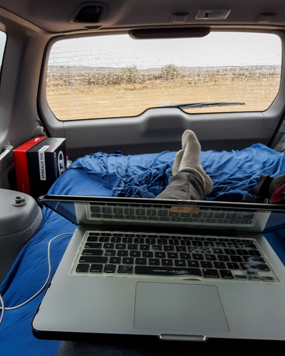 Tuesday turned out to be a rainy day (of course it would rain my first day setting up in the desert), which quickly turned the dirt roads on the BLM land into thick mud, which made me nervous as I slid through it in my car. I chose a spot not far from the exit off the highway so as not to get myself stuck somewhere. And then I worked in the car that day, not wanting to put together my work setup in the wind and rain. It was cozy, but it sufficed.