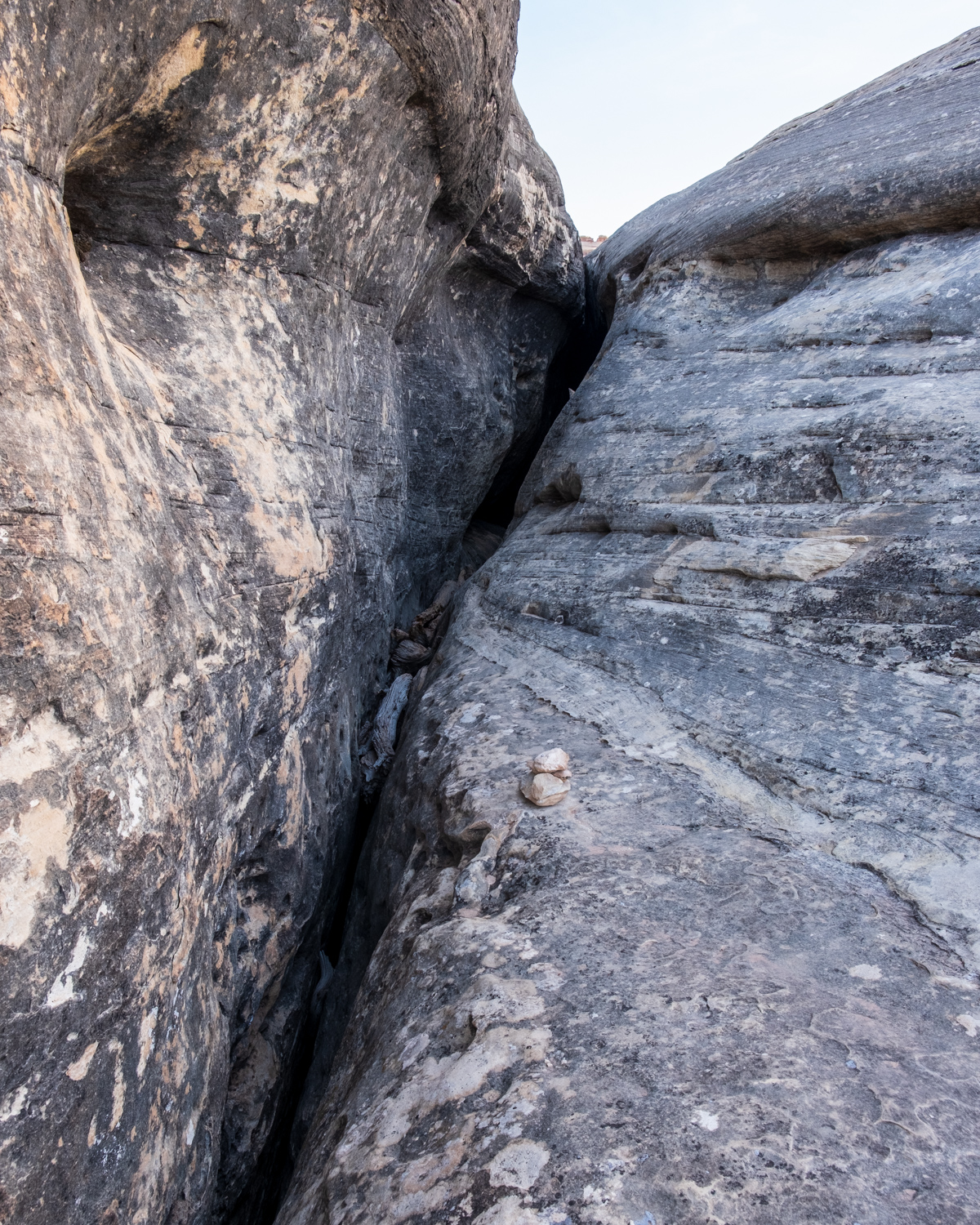 I didn’t end up walking again until around 4pm. That was just as well, because by then the sun had passed over the canyon and wouldn’t be directly beating down on me for the rest of the day. After walking in a washout for a while, the trail meandered up onto some slickrock and I was presented with a small slit in the canyon wall. I looked around for the cairns that had marked my route so far, and evidently, they directed me straight through this slot.