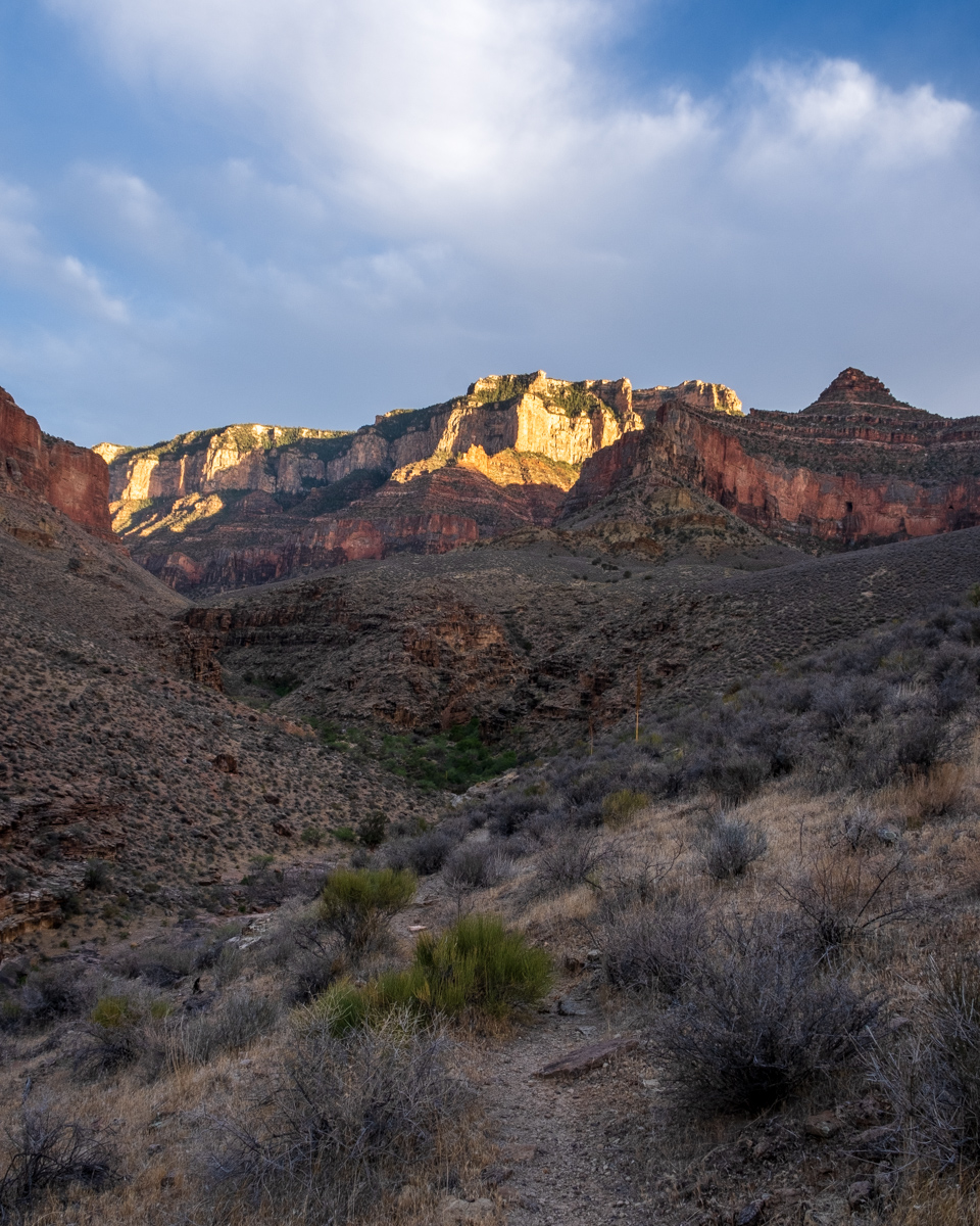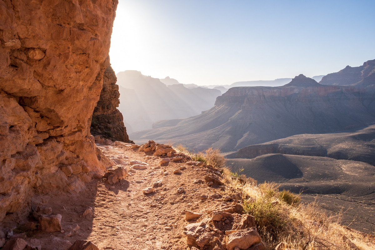 The forecast was a high of 94°F for this day, so in order to keep my hiking to the cooler hours, I got a shuttle nice and early, leaving my car at my Tanner Trailhead, and arriving at S Kaibab Trailhead before 5am. (I’ll let you take a guess at what ungodly hour I had to wake up for that.) So I got a nice view of the rising sun as I descended thousands of feet into the canyon.