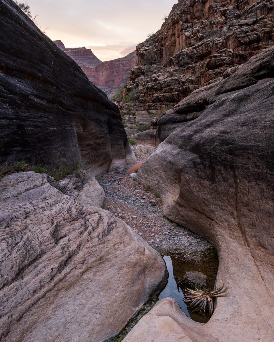 By the end of the conversation, we decided to meet at Grapevine Canyon and camp together for the night, and I went on ahead. According to the ranger I had spoken with, the water source was upcanyon from the trail, so I turned off the trail and wandered up in search of it. I must’ve walked for over a half-mile before finally finding a faint trickle. But that trickle was more than I had seen all day, so I patiently filled up my reservoirs before heading back downcanyon.